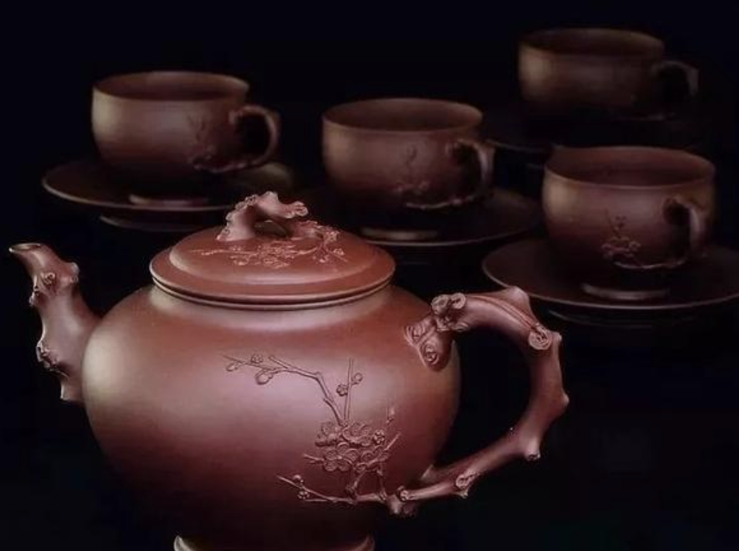 這一套茶具創造的閉頭是供春壺的身筒和杯子的身筒,由于供春壺壺身是“樹癭”,也即是大樹虬枝上的樹瘤,有凹有凸。樹癭紋路要亂而沒有散,完全效驗又央求骨血勻和、精力豐滿,藝術作風協調一致。